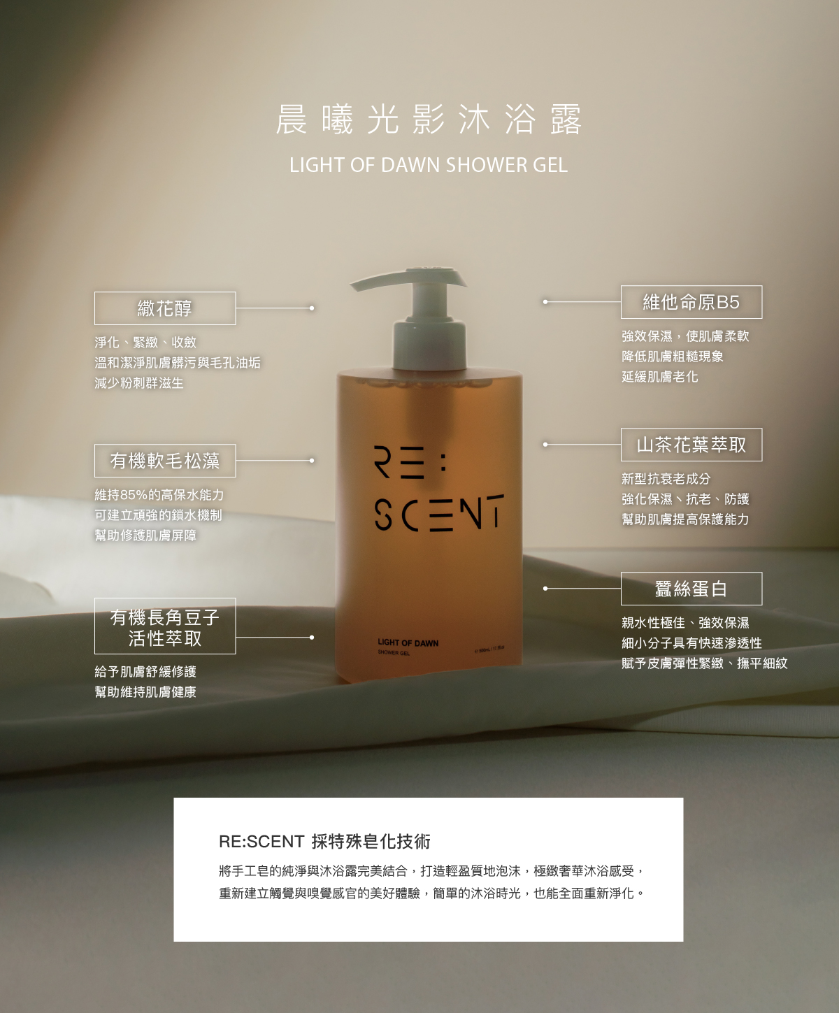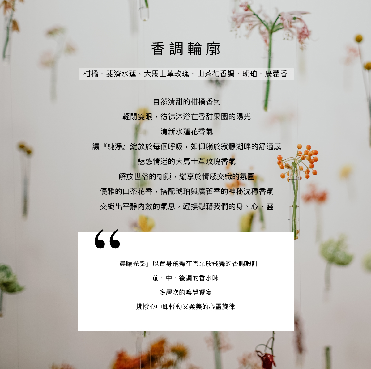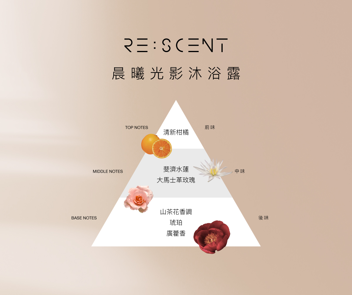 「晨曦光影」沐浴露以置身飛舞在雲朵般飛舞的香調設計,前、中、後調的香水味,