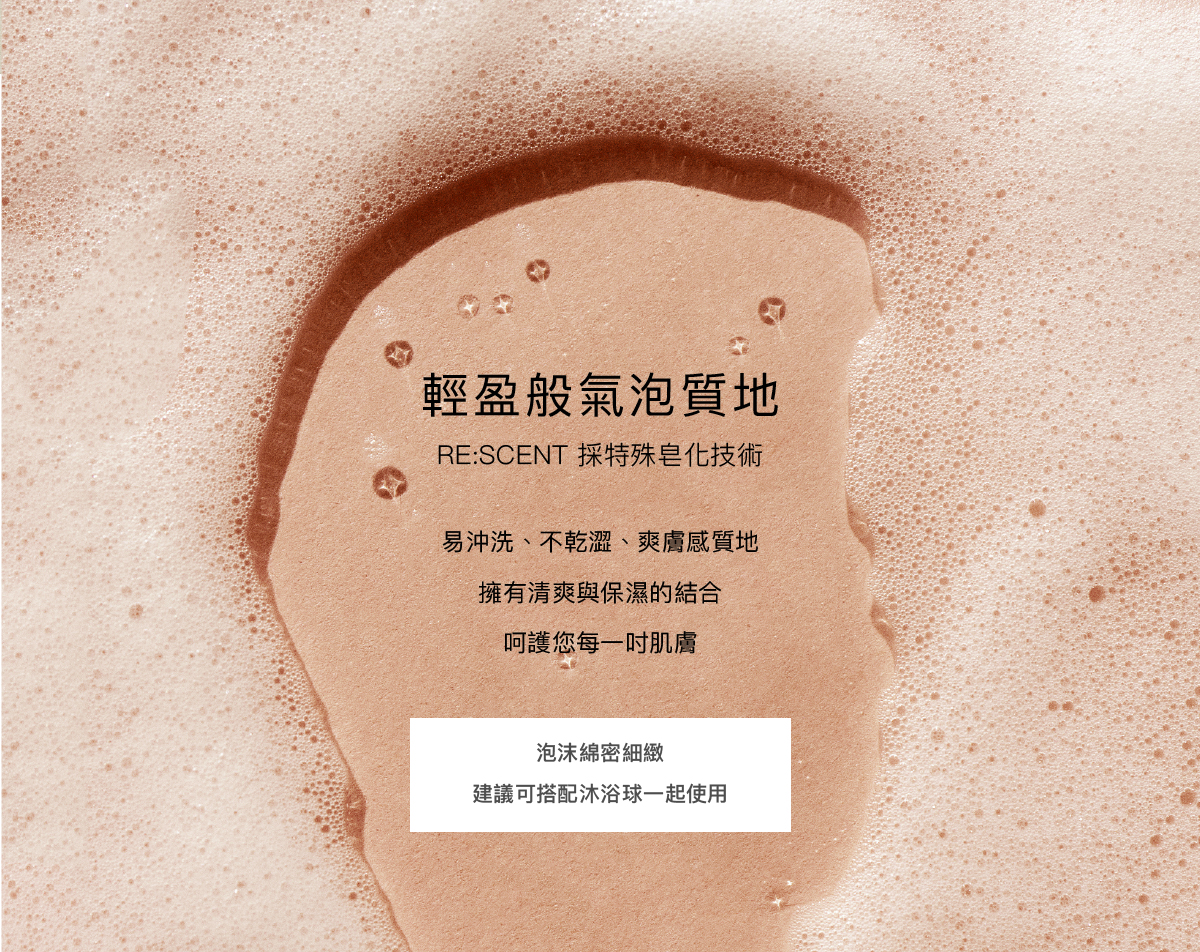 特殊皂化技術 | 輕盈質地泡沫,創造易沖洗,不乾澀,清爽感質地技術,享受極致奢華沐浴時光