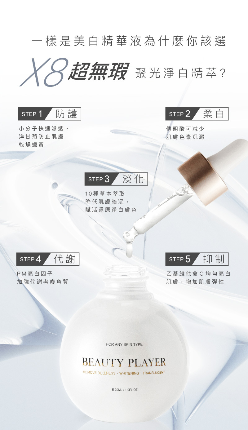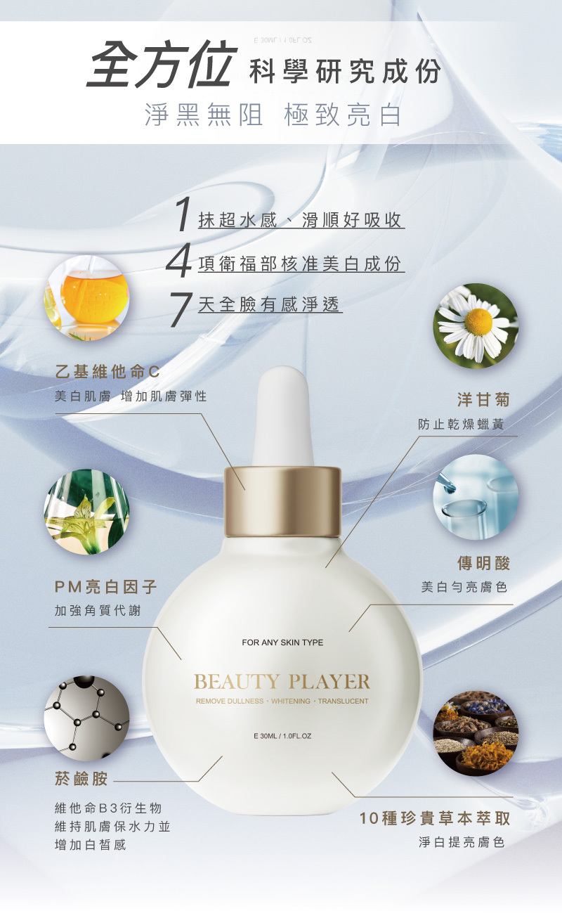 洋甘菊精、傳明酸、 PM亮白因子、乙基維他命C